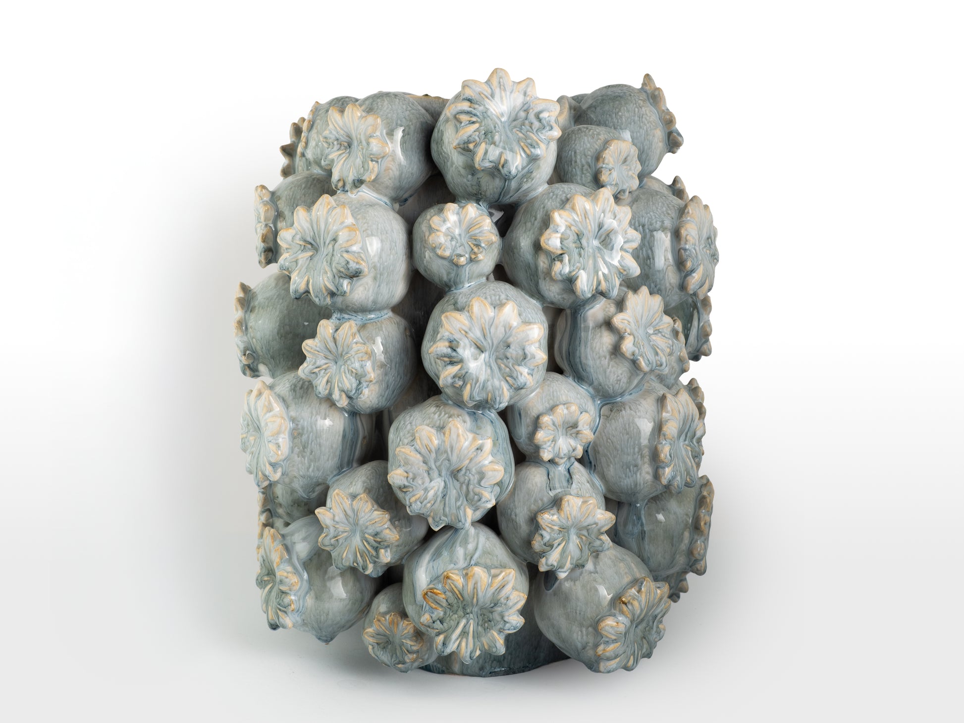 El jarrón está cubierto con formas decorativas en forma de vainas de amapola, hechas y aplicadas a mano.